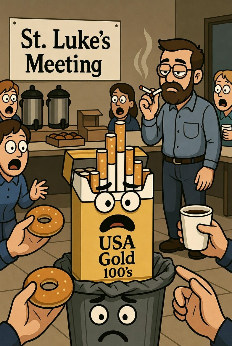 Sandusky, OH — When local man Chet Kramer picked up a fresh pack of USA Gold 100’s from his neighborhood smoke shop, the cigarettes had no idea what kind of hell awaited them at Tuesday night’s St. Luke’s AA meeting.